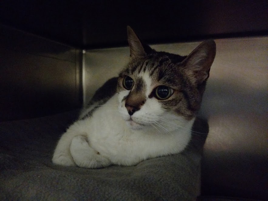 My name is Spots and I am a 2 year old FIV+ male. I am a friendly young guy that likes to make friends, but I sometimes just take a little bit of time to build trust. Unsure what FIV is? Ask the staff - they're happy to explain! My feline-ality is "Personal Assistant". You're working on the computer? Let me press the keys. Reading the paper? I'll hold the pages down for you. Watching TV? I'll just plop in your lap so you can pet me. I love an orderly household, don't you? I'll help you with all your chores, and I'll help you relax when we're done. You'll wonder how you ever managed without me.
