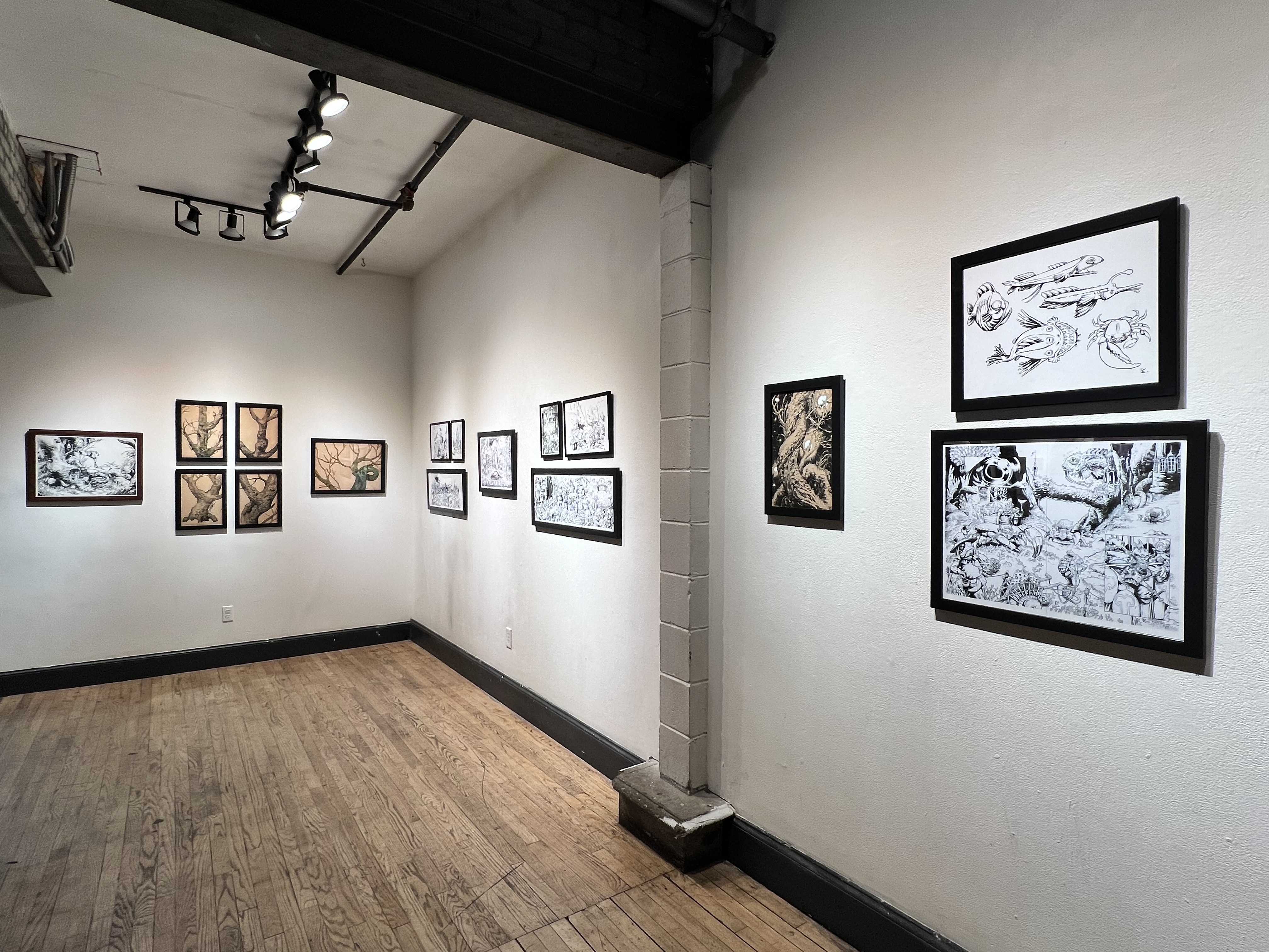 Nolan has created artworks that have found homes on many platforms, from illustrations used in comic books to the packaging for beer. In his show, viewers can see a cross-section of the types of drawings he has created for a variety of purposes. The commonality among them all tends to be his deft use of line. Some of the lines in his drawings are thick and direct while others are suggestive, as if he rendered them with a slight flick of the wrist. There is a lot of nuance in this artist’s work, as well as plenty of imagination and fun too.