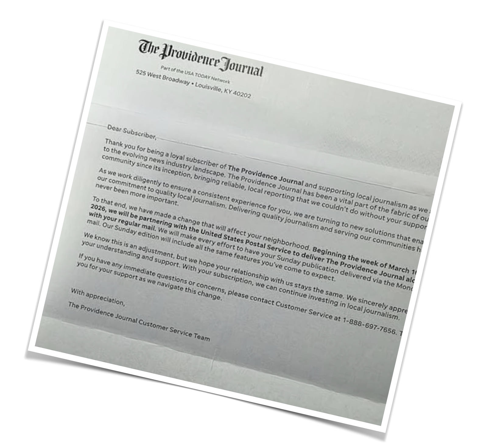 The letter is signed by the Providence Journal customer service team.